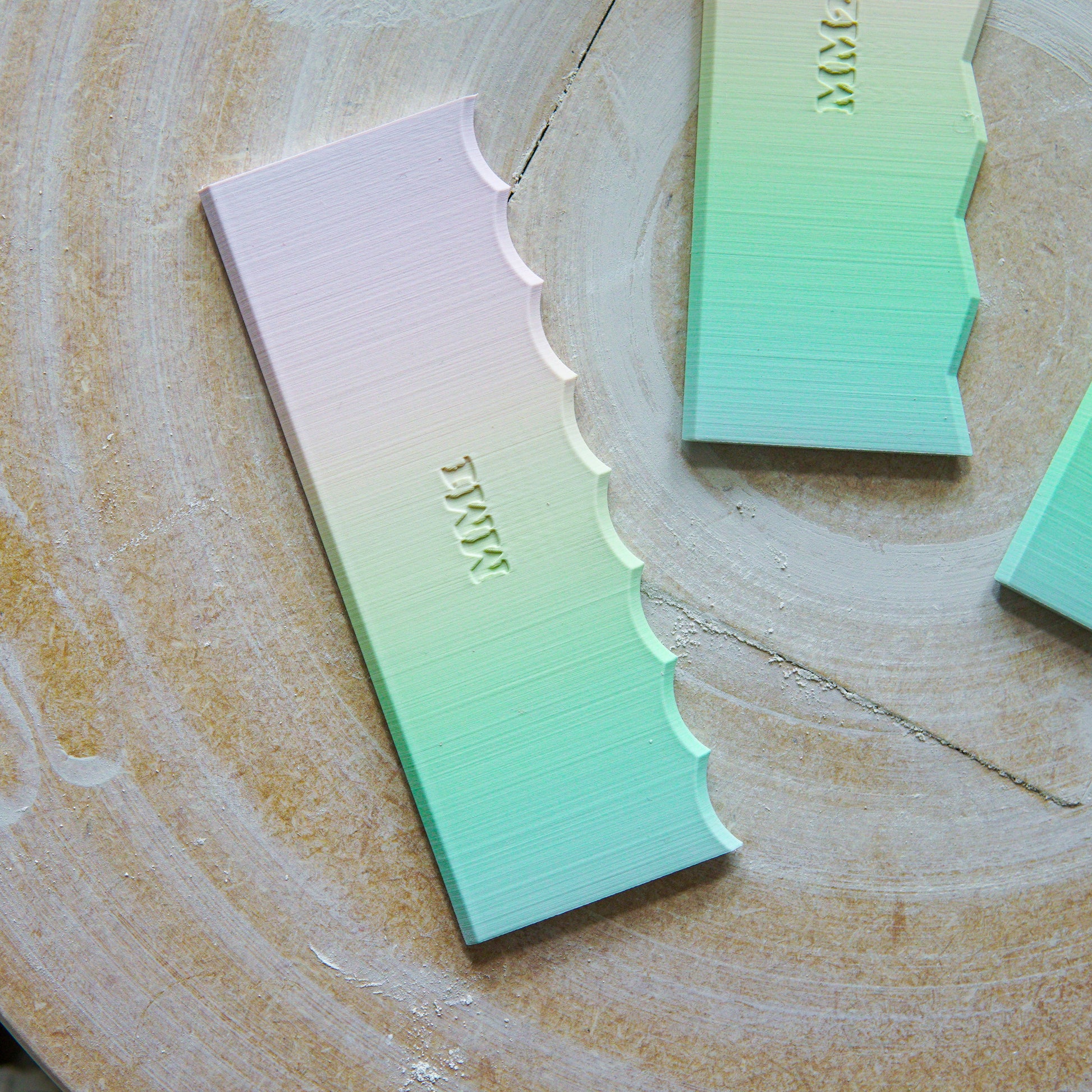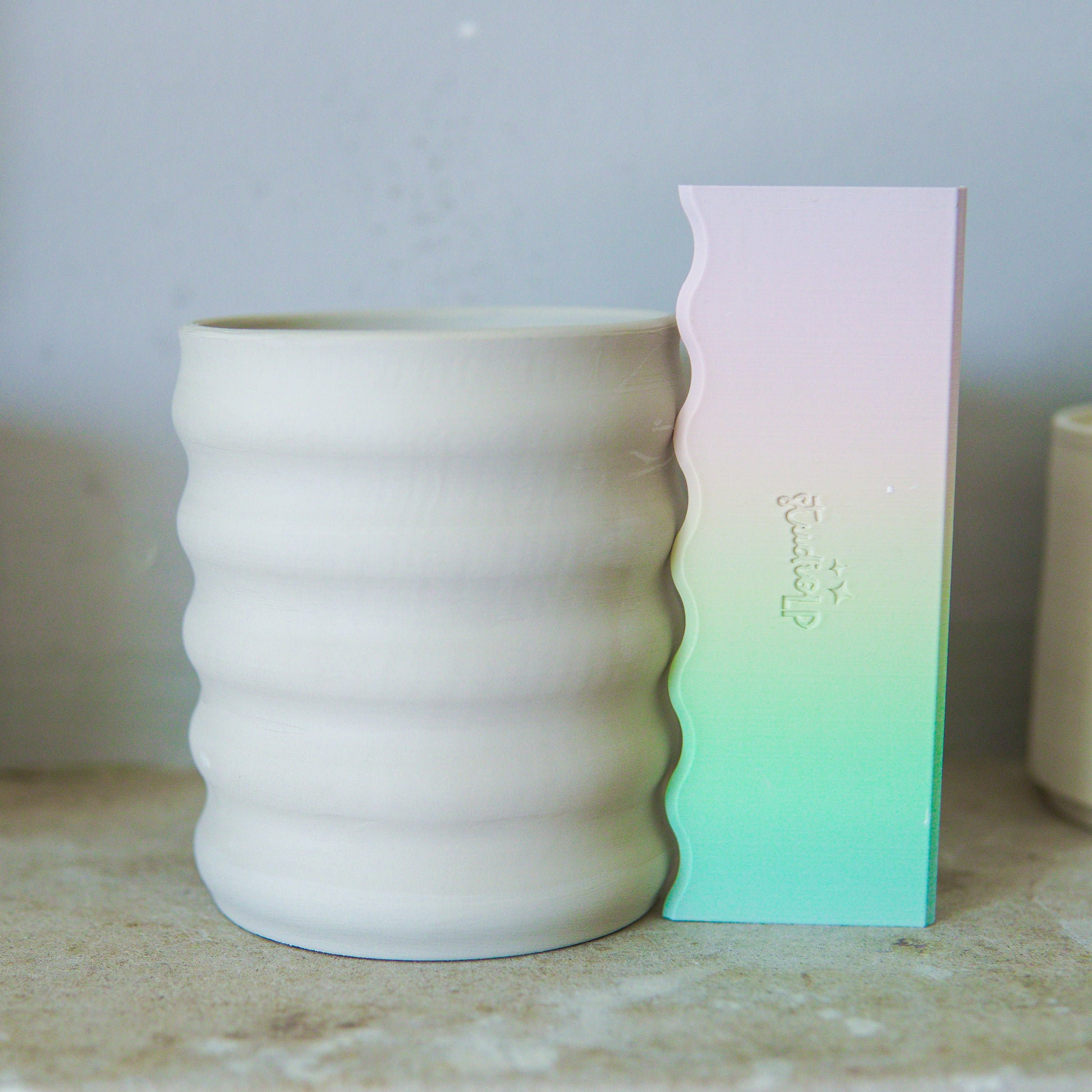 I keep one side of the tool straight because I always find it useful to have a straight edge to hand and means less tools on my wheel at once when I'm throwing. I use a straight edge to create my cylinder before I then go in with the texture edge.