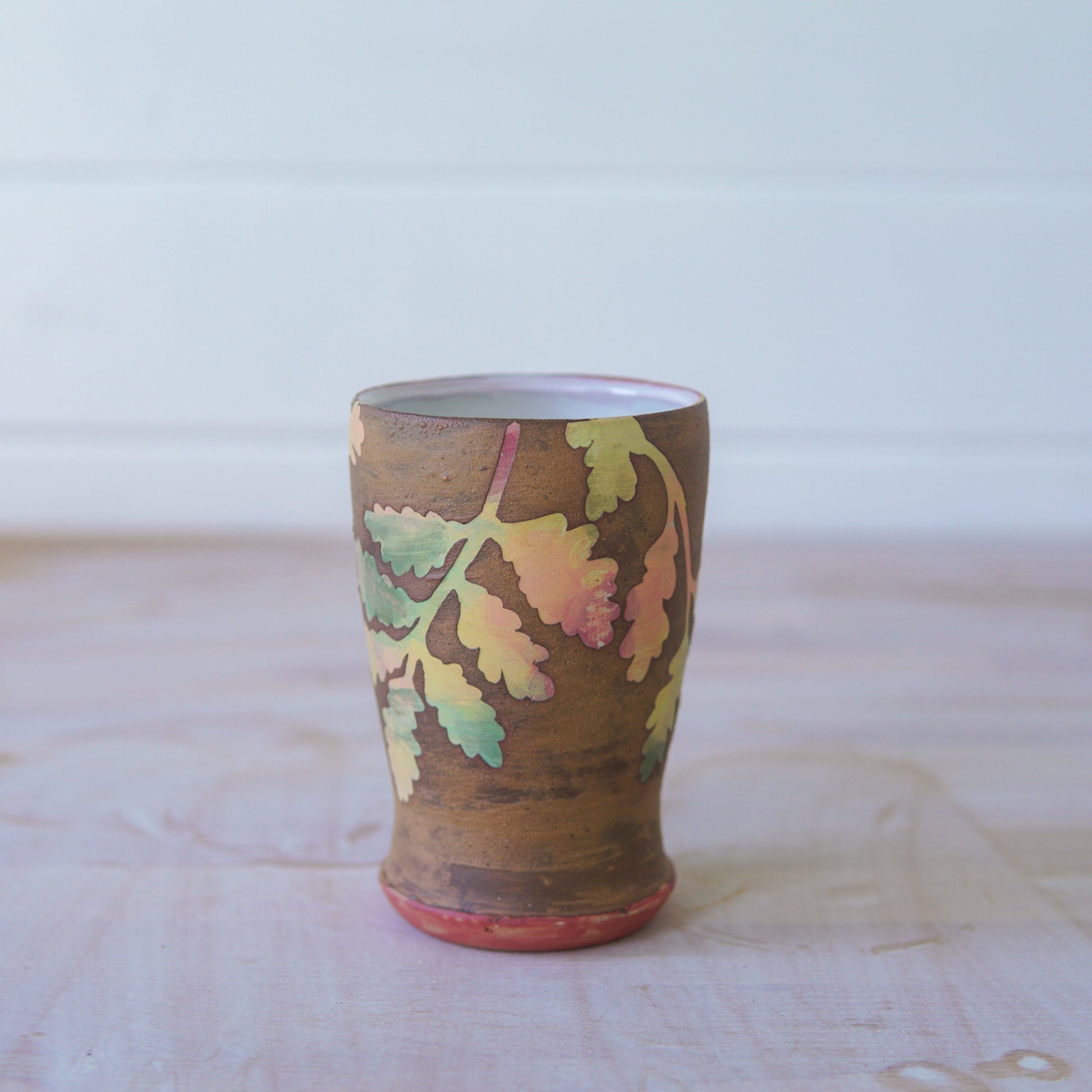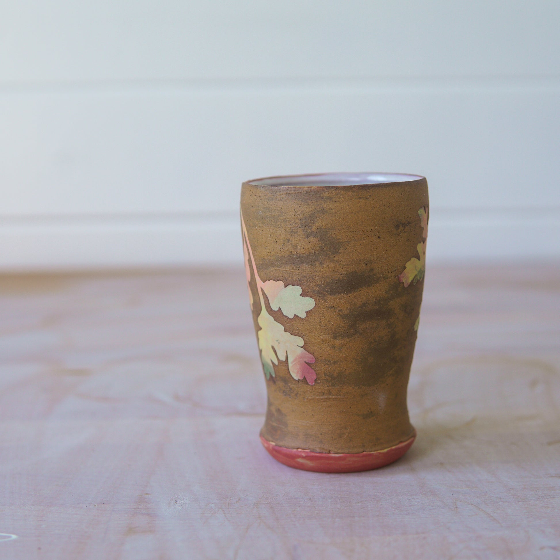 A wheel thrown, stoneware cup. Decorated by hand illustrated stencils and underglaze, covered with local (Rutland) wild clay, dug and processed by hand in my studio. The raw iron rich clay gives a rusted effect (but it won't rub off like real rust don't worry!).