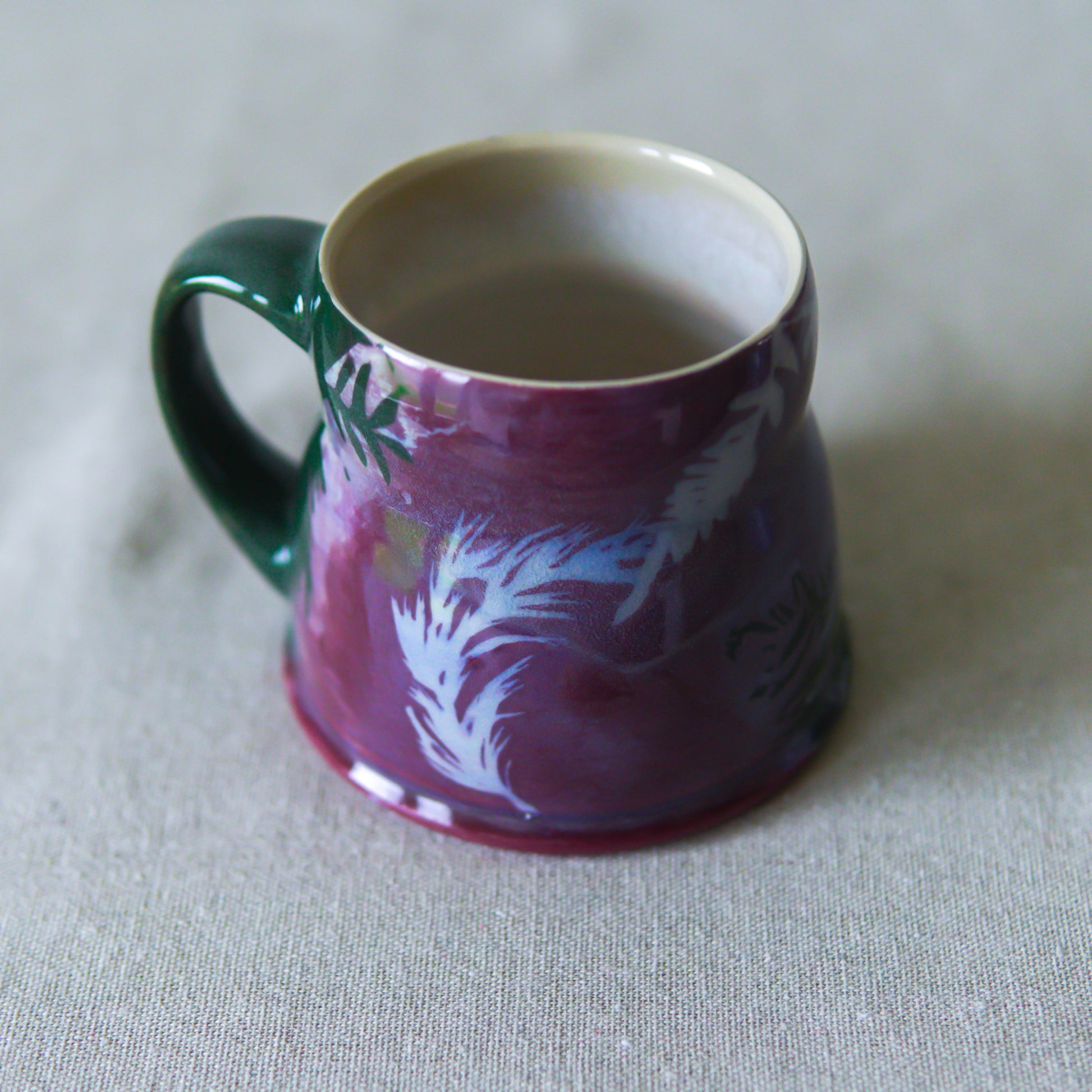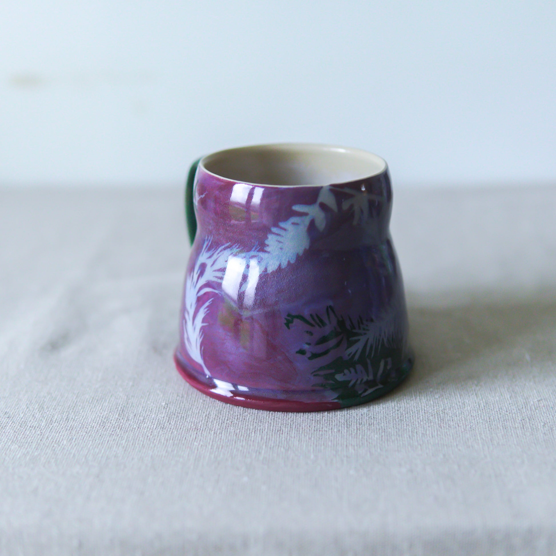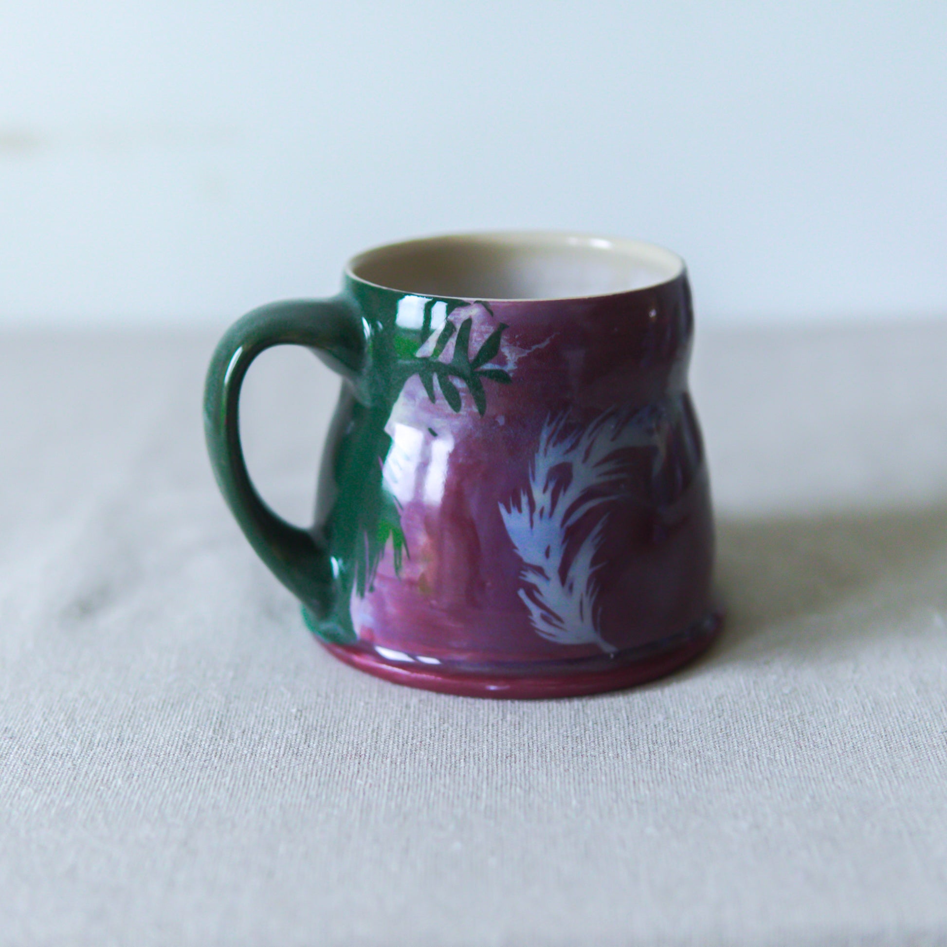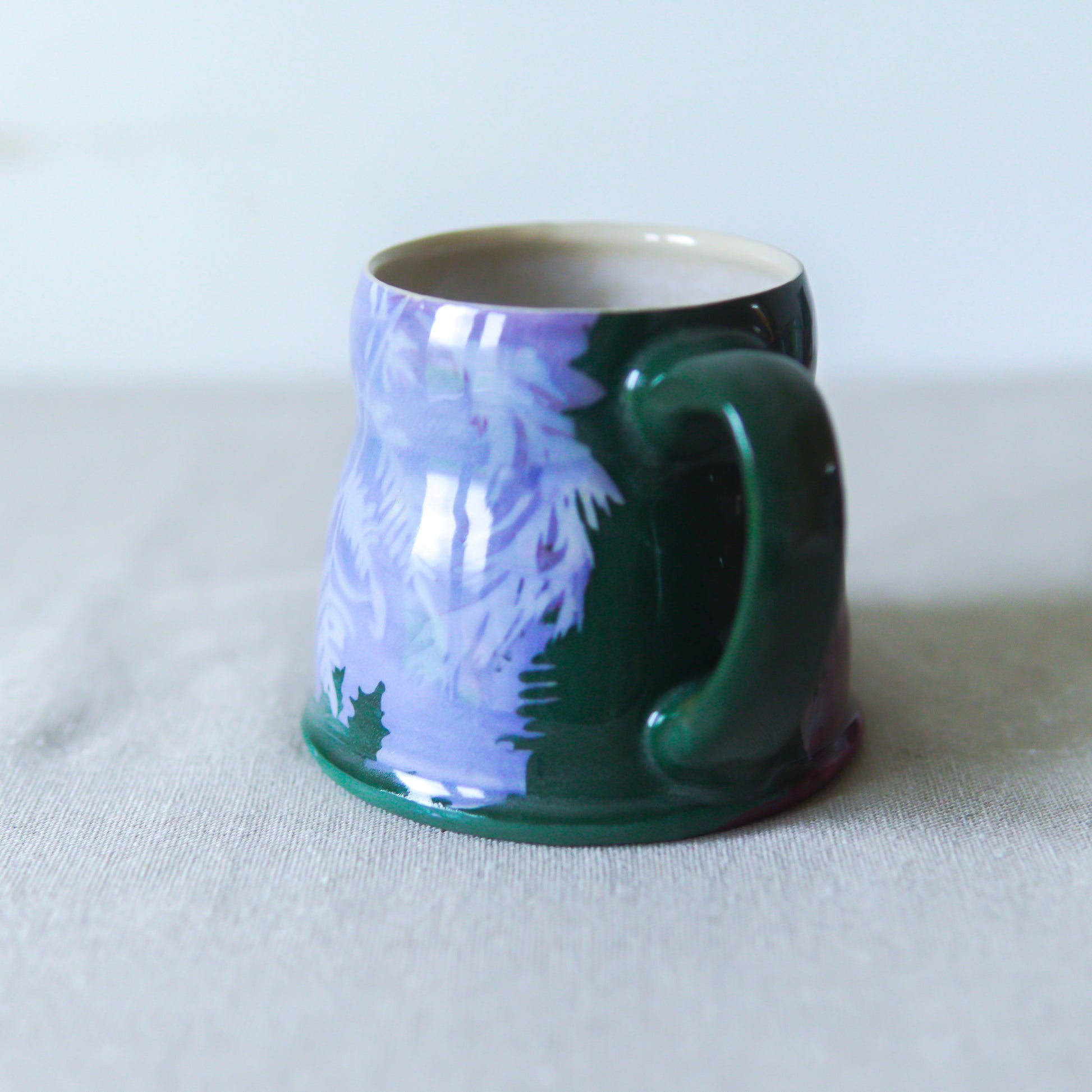 Handmade stoneware mug featuring my illustrated stencils, inspired by winter evergreens. Glossy surface inside and out.